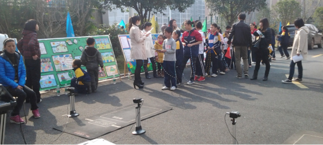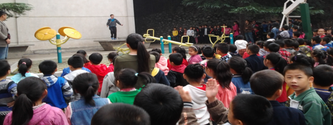 5、文英小學,由校長主持表演,原本一橫排整齊的站隊,表演開始后,學生不禁往前涌,將不大的舞臺包圍,表演受到強烈的關注。