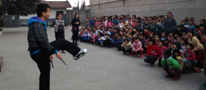 3、95338部隊小學大課間,教練組表演了精彩絕倫的花式跳繩,底下學生一片尖叫,接下來的一段時間,學校課間到處都可見到跳繩的同學,蹦蹦跳跳,相互切磋。