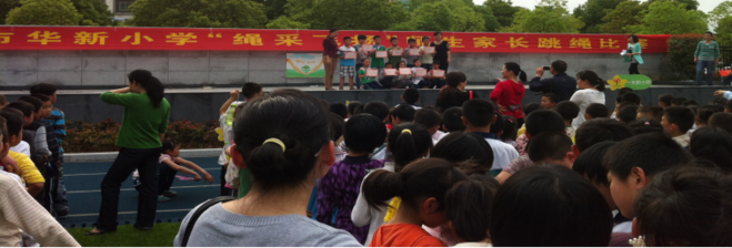 華新小學跳繩比賽,經過一段時間的全校普及,學校舉辦了種類多樣的跳繩比賽,師生一起來跳繩,其樂融融